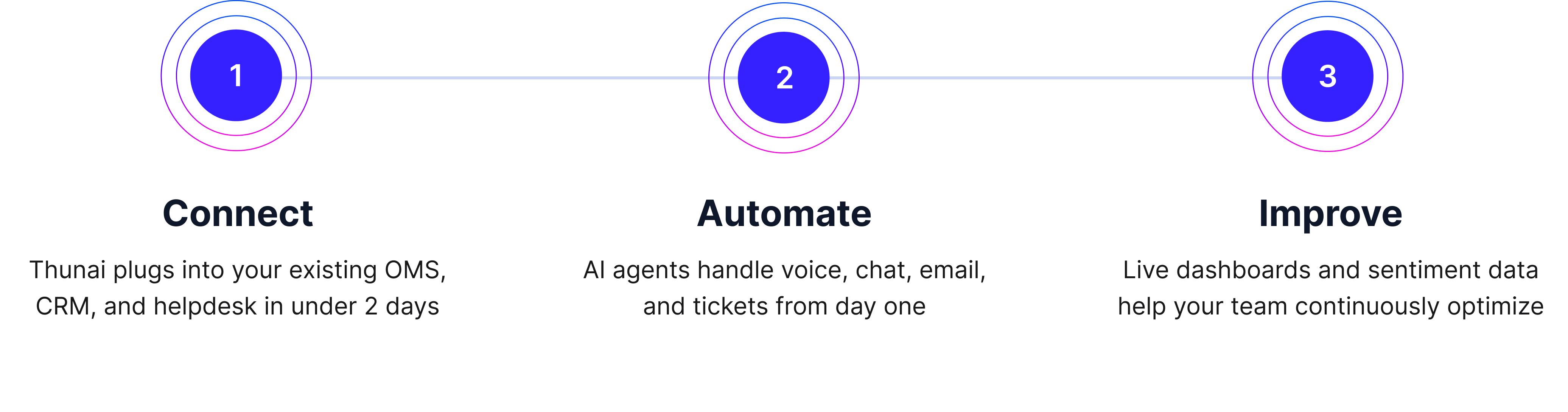 Retail tech stacks are typically fragmented across CRMs, order management systems, helpdesks, and legacy databases —each holding a piece of the customer picture. Thunai AI solves this by acting as a unifying layer that reads and writes data across all connected systems in real time, giving agents and AI alike a complete, accurate view without manual retrieval or data duplication.