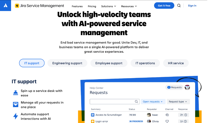 - Jira Service Management is the top choice for ITSM if your company uses the Atlassian suite. It connects deeply with Jira Software workflows and Confluence knowledge bases.