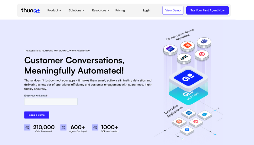 - Native Workflow Automation: A key differentiator is Thunai's ability to turn a company's Standard Operating Procedures (SOPs) into executable workflows. This allows AI agents to take direct actions within connected systems like Salesforce and HubSpot. It does this without relying on intermediary automation tools.